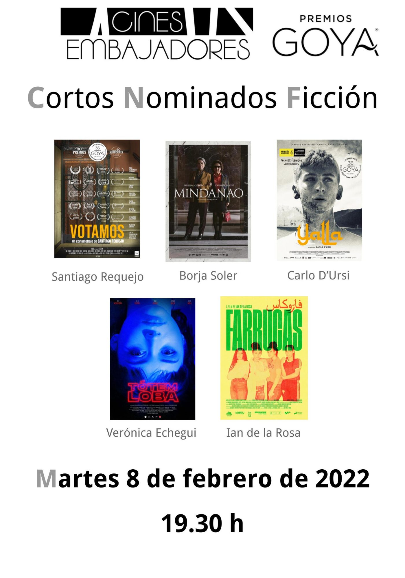 Los cines Embajadores se suman al apoyo del cine español y al impulso de los trabajos nominados a los premios Goya 2022. Apostamos por el cortometraje como género propio y de su exhibición en salas de cine. En esta ocasión, podremos disfrutar de una sesión única con los cortometrajes de ficción nominados.