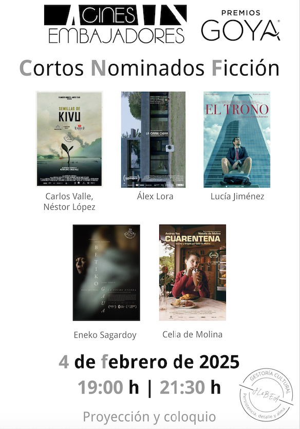 Los CINES EMBAJADORES de Madrid se suman al apoyo del cine español y al impulso del ámbito del cortometraje. Apostamos por el cortometraje como género propio y su exhibición en salas de cine. En esta ocasión, podremos disfrutar el martes 4 de febrero de una sesión con los cortometrajes nominados a los GOYA en la categoría de ficción más un documental. La sesión está organizada y conducida por Beatriz Martínez y José Luis Palacios, socios de la Coordinadora del Cortometraje y jurado de público de varios festivales nacionales de cortometrajes.