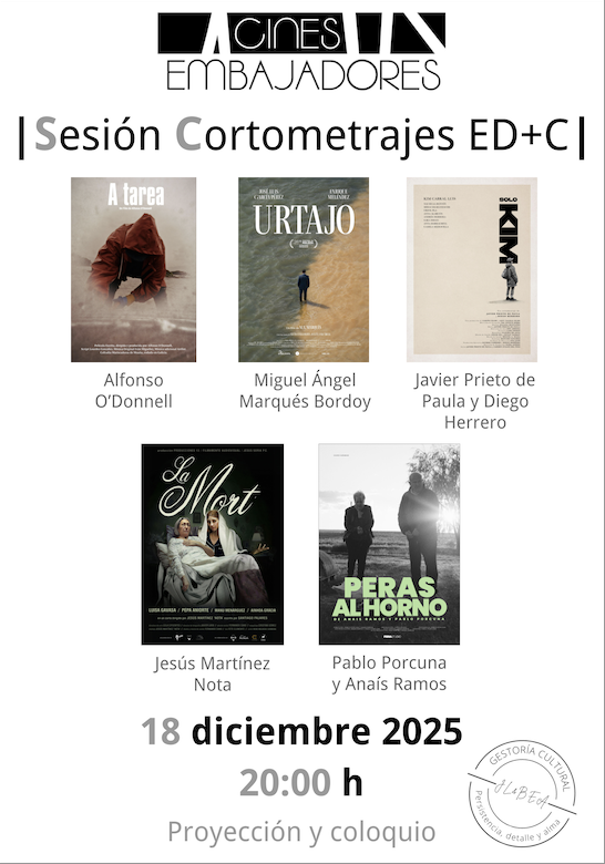Los CINES EMBAJADORES de Madrid se suman al apoyo del cine español y al impulso del ámbito del cortometraje. Apostamos por el cortometraje como género propio y de su exhibición en salas de cine con coloquio posterior, de la mano de José Luis Palacios y Beatriz Martinez, comisarios cinematográficos y miembros de la Coordinadora del Cortometraje Español. En esta ocasión, podremos disfrutar de una sesión especial dentro de la iniciativa de El día más corto [ED+C] para celebrar el solsticio de invierno con diversas historias y temáticas. Al finalizar tendremos un coloquio y análisis con directores/equipos y público.