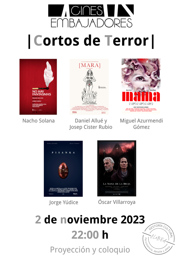 exhibición en salas de cine con coloquio posterior, de la mano de José Luis Palacios y Beatriz Martinez, comisarios cinematográficos y miembros de la Coordinadora del Cortometraje Español. En esta ocasión, aprovechando la proximidad de Halloween, podréis disfrutar de una selección de cortometrajes españoles de terror.