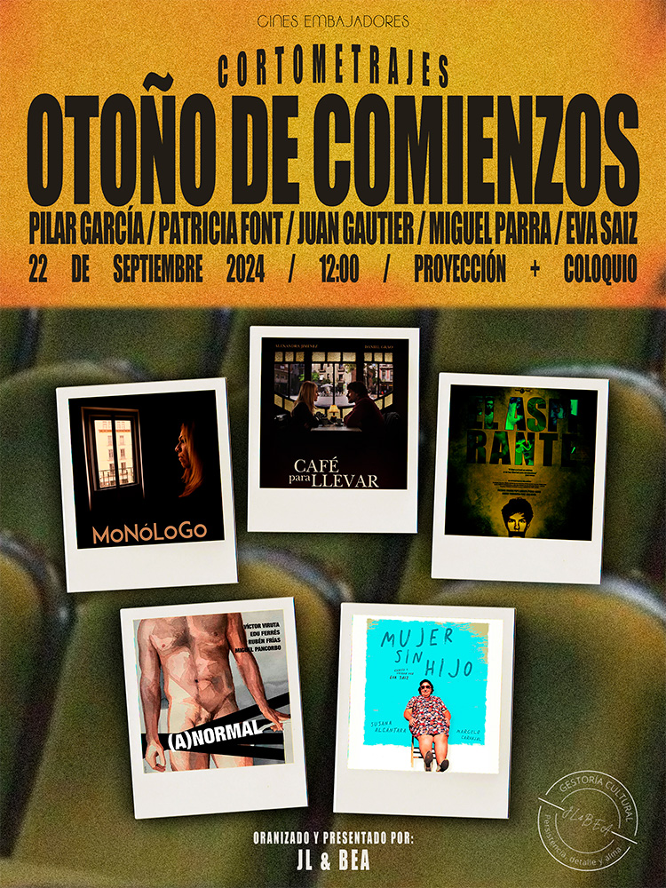 Los CINES EMBAJADORES de Madrid se suman al apoyo del cine español y al impulso del ámbito del cortometraje. Apostamos por el cortometraje como género propio y de su exhibición en salas de cine con coloquio posterior, de la mano de José Luis Palacios y Beatriz Martinez, comisarios cinematográficos y miembros de la Coordinadora del Cortometraje Español. En esta ocasión, una sesión de cortometrajes para celebrar el comienzo del otoño con una serie de historias muy interesantes basadas en esos comienzos que se suelen dar en esta época (nuevas temporadas, nuevos cursos, cambios de vida, rupturas con el pasado,…).